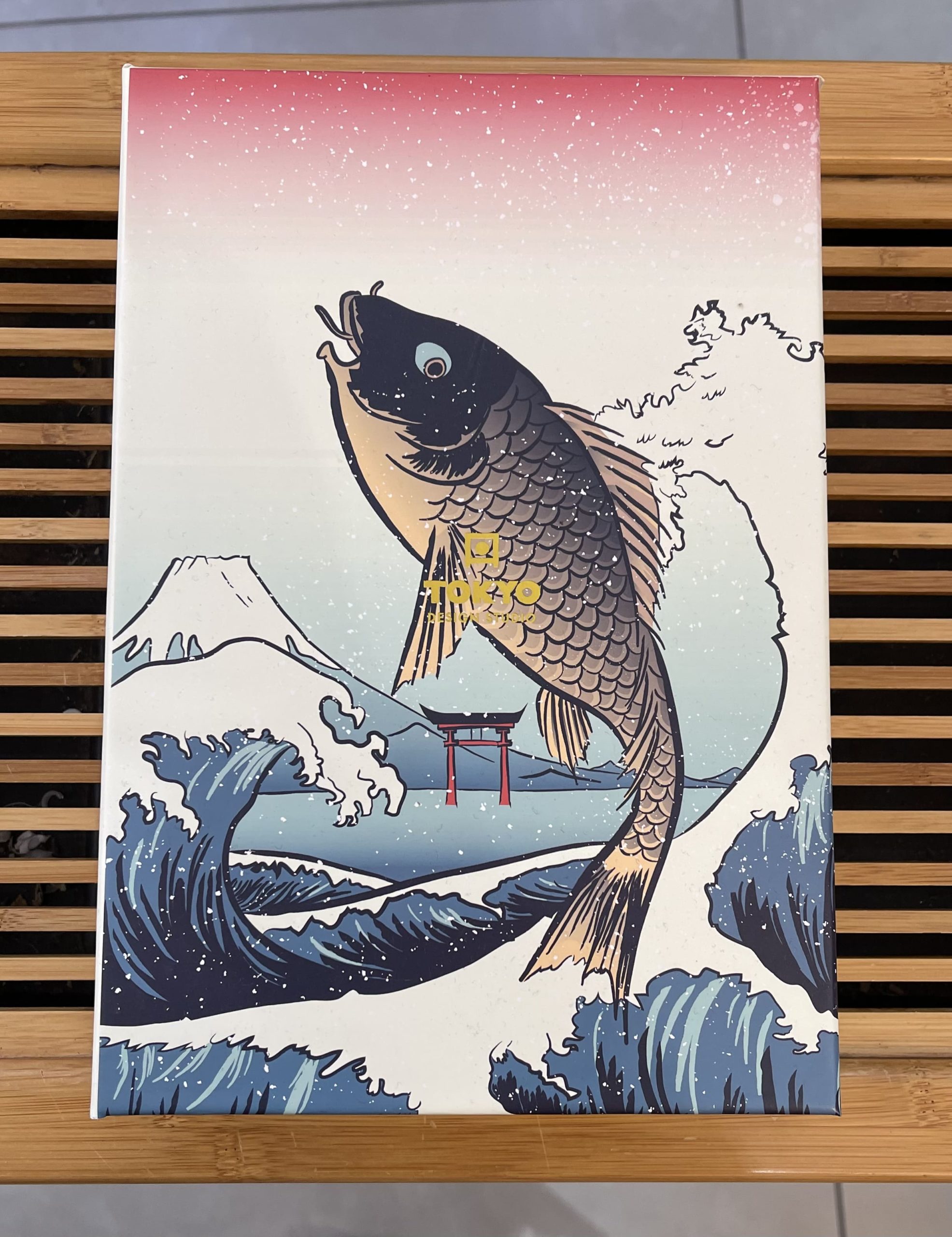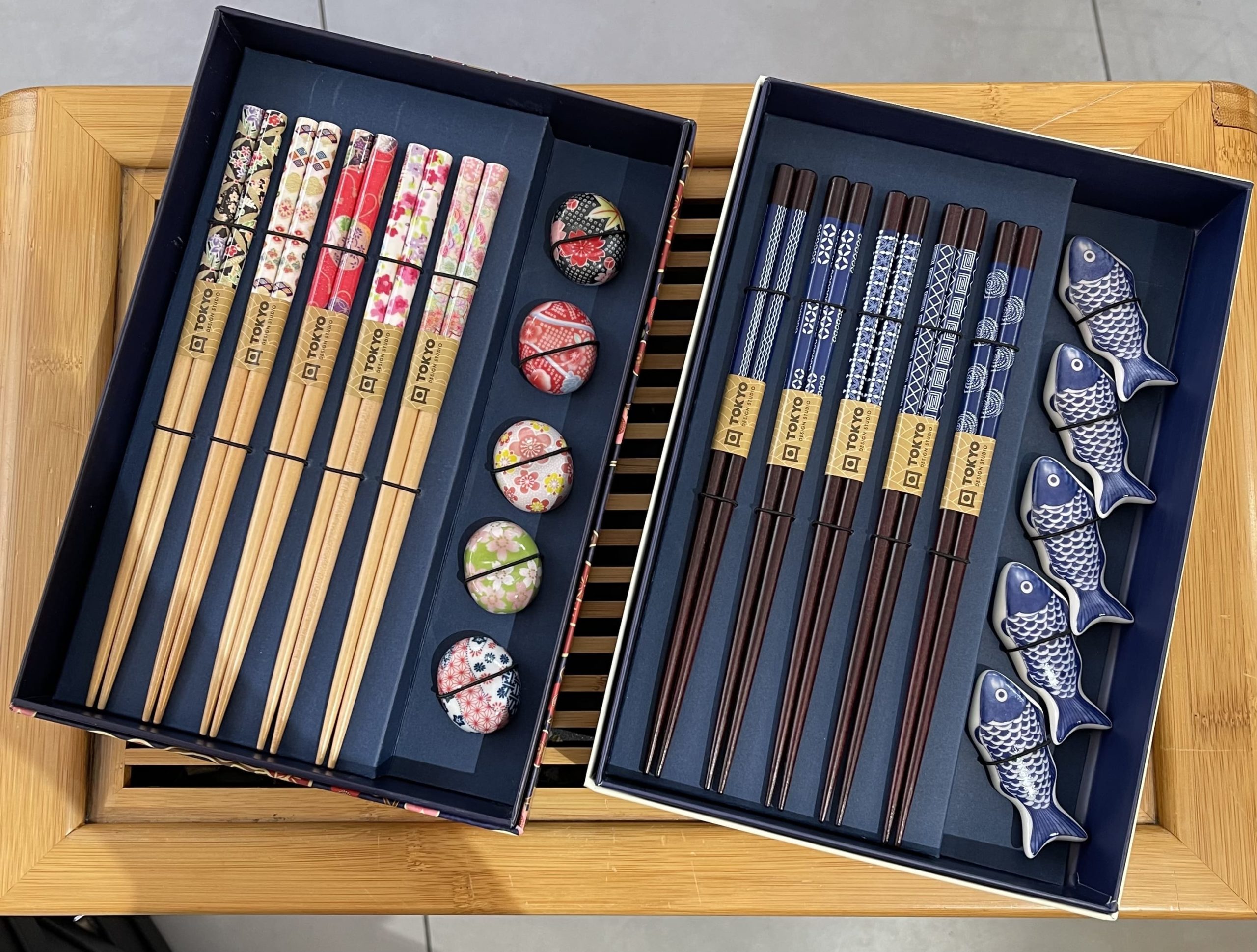 Très belle idée cadeau que cet assortiment de 5 paires de baguettes aux motifs variés (soit fleuris, soit poisson) avec des reposes baguettes assortis. Très beau coffret!