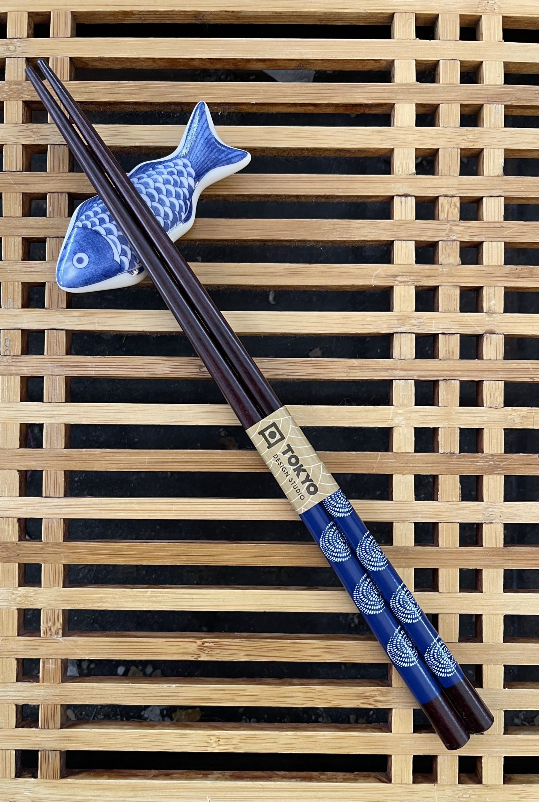 Matériaux: bois peint et verni pour les baguettes – céramique pour les reposes baguettes