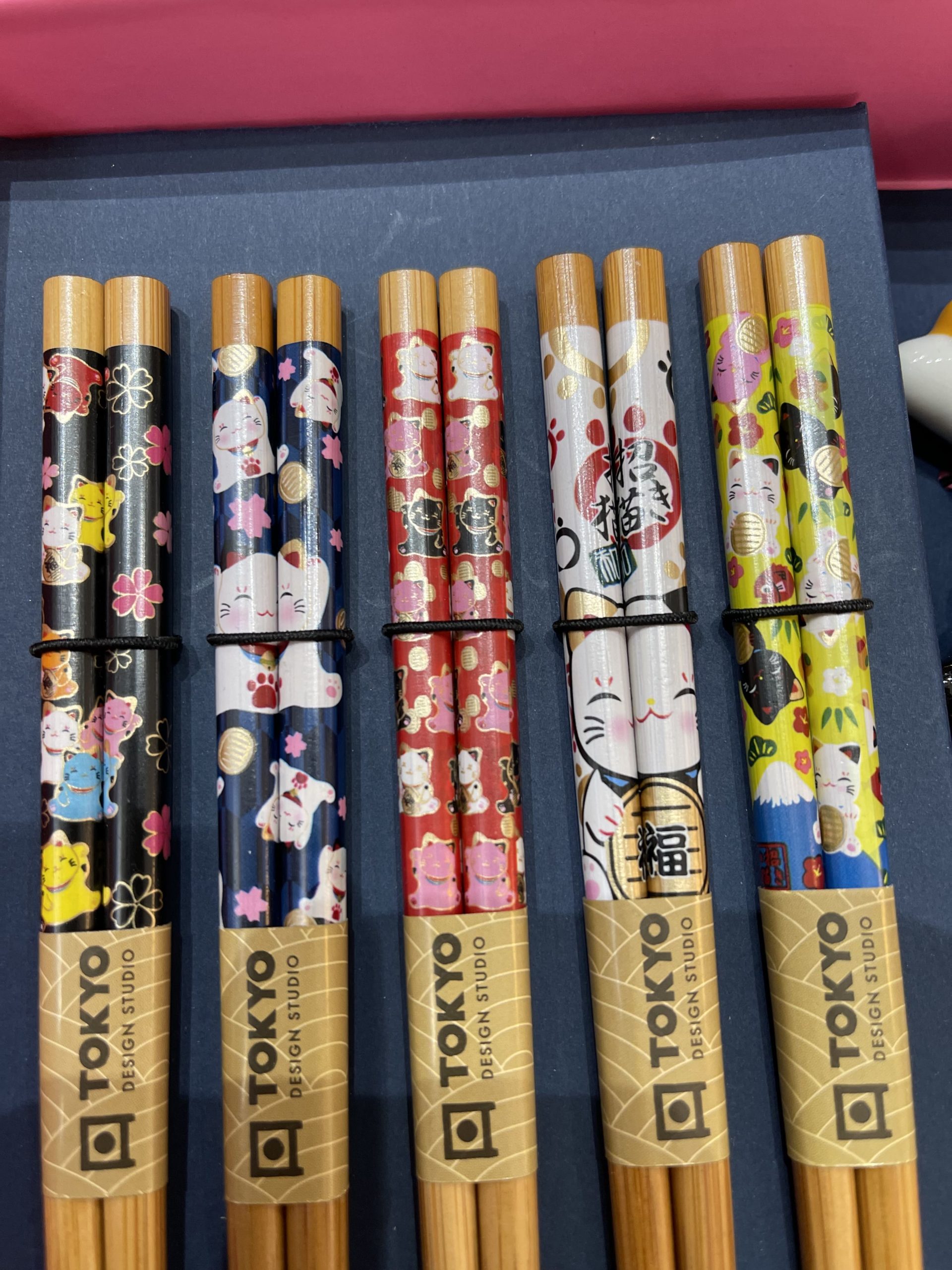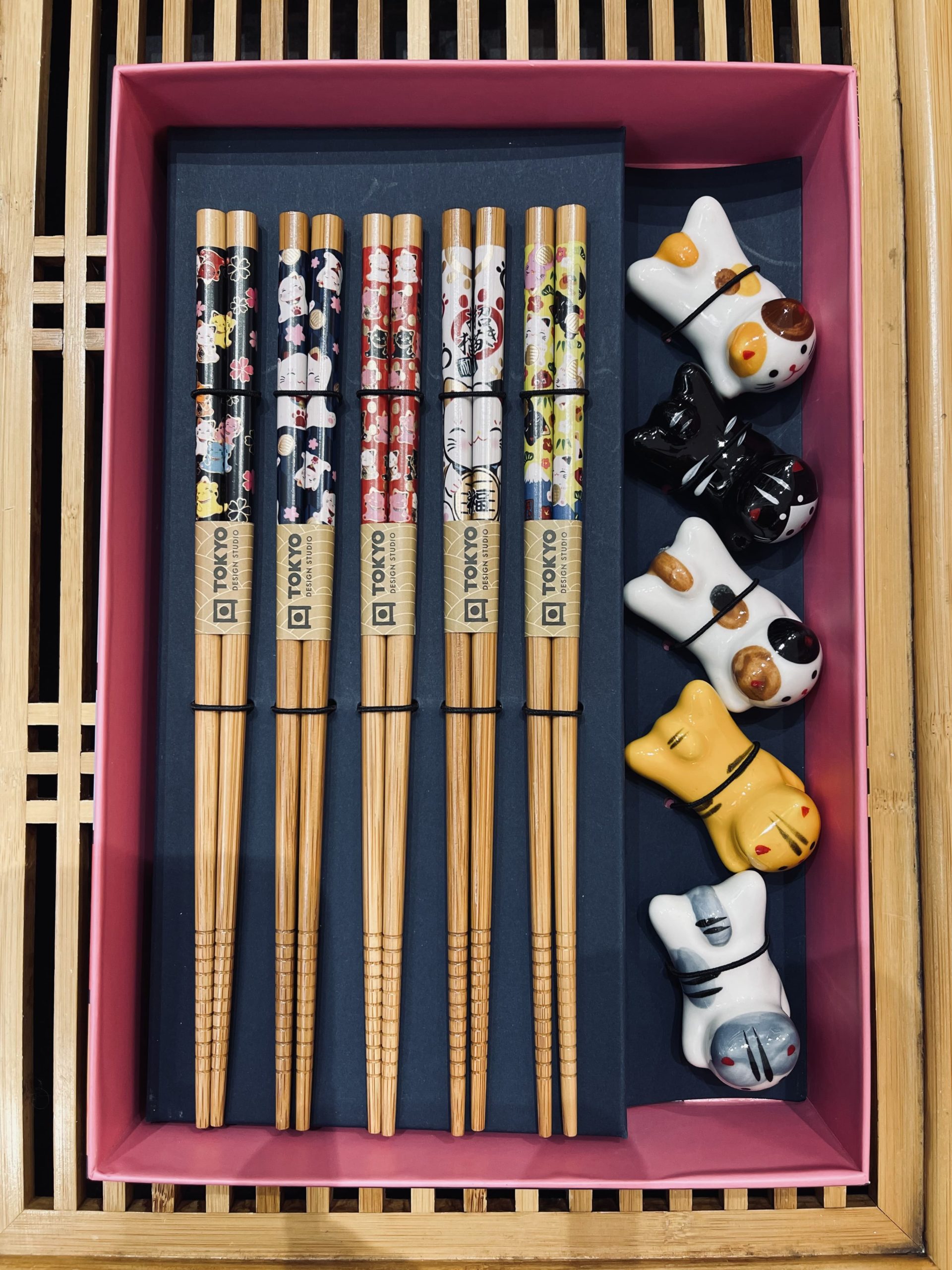 Super idée cadeau avec un coffret beau et ultra kawaï contenant 5 paires de baguettes Neko et les reposes baguettes assortis.