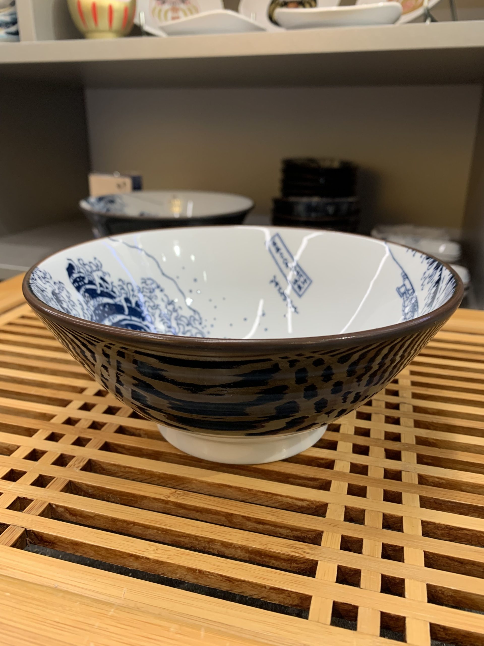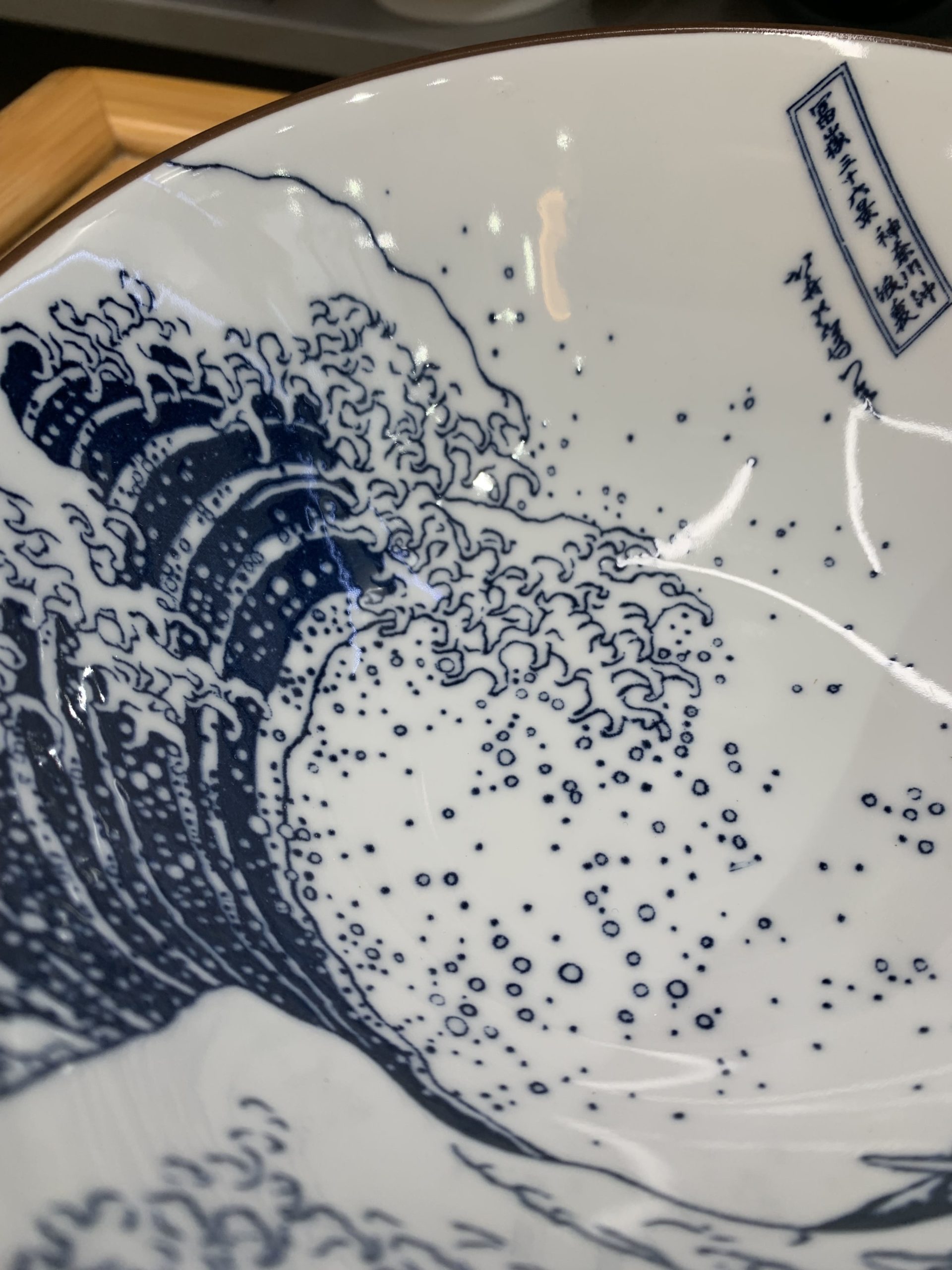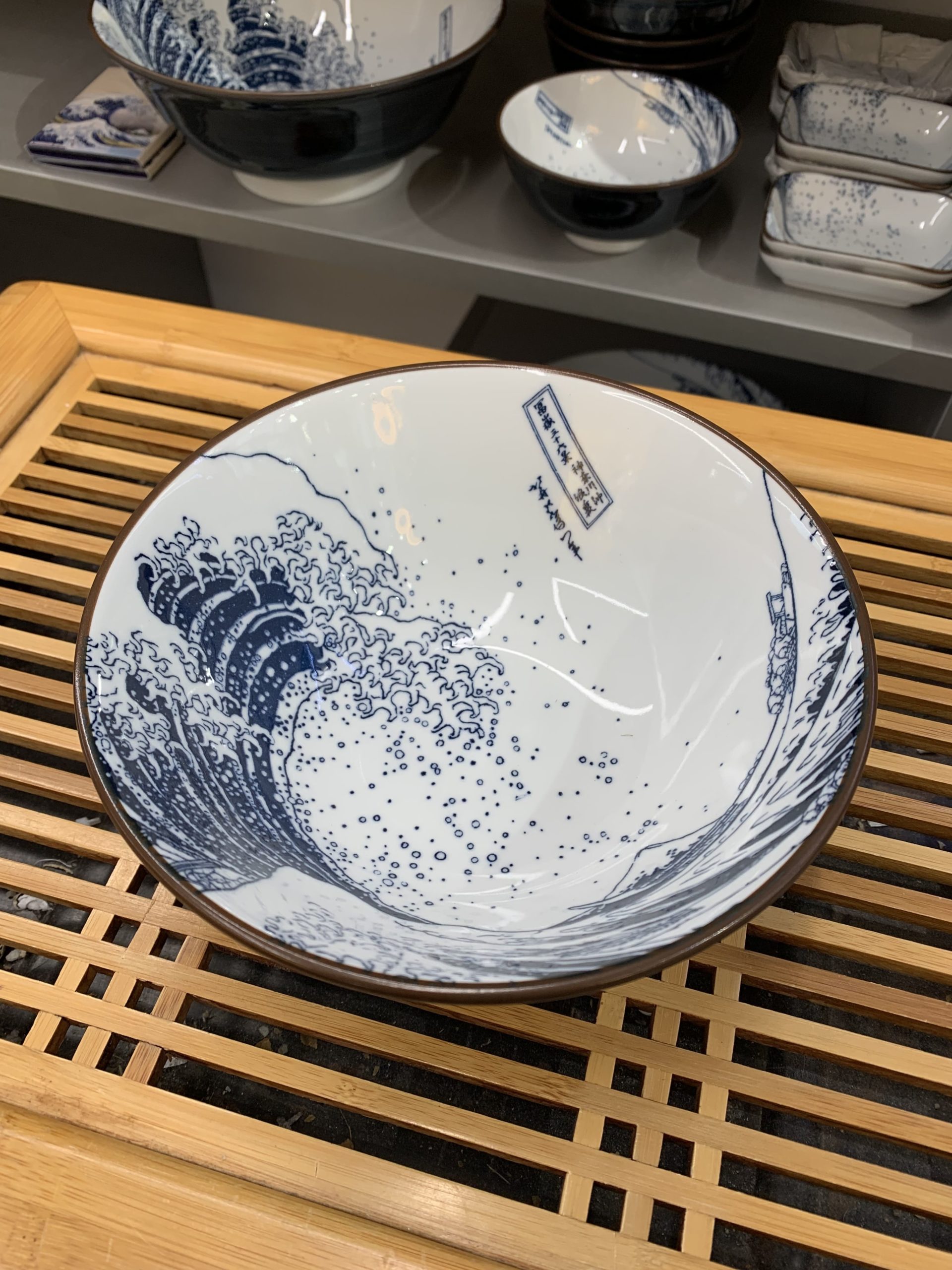 Bol à matcha au motif incontournable de la Grande Vague du maître Hokusai. Aussi beau dedans avec une reproduction fidèle que dehors avec un effet pinceau. Parfait aussi pour un bonne soupe miso ou encore pour tout accompagnement imaginable.