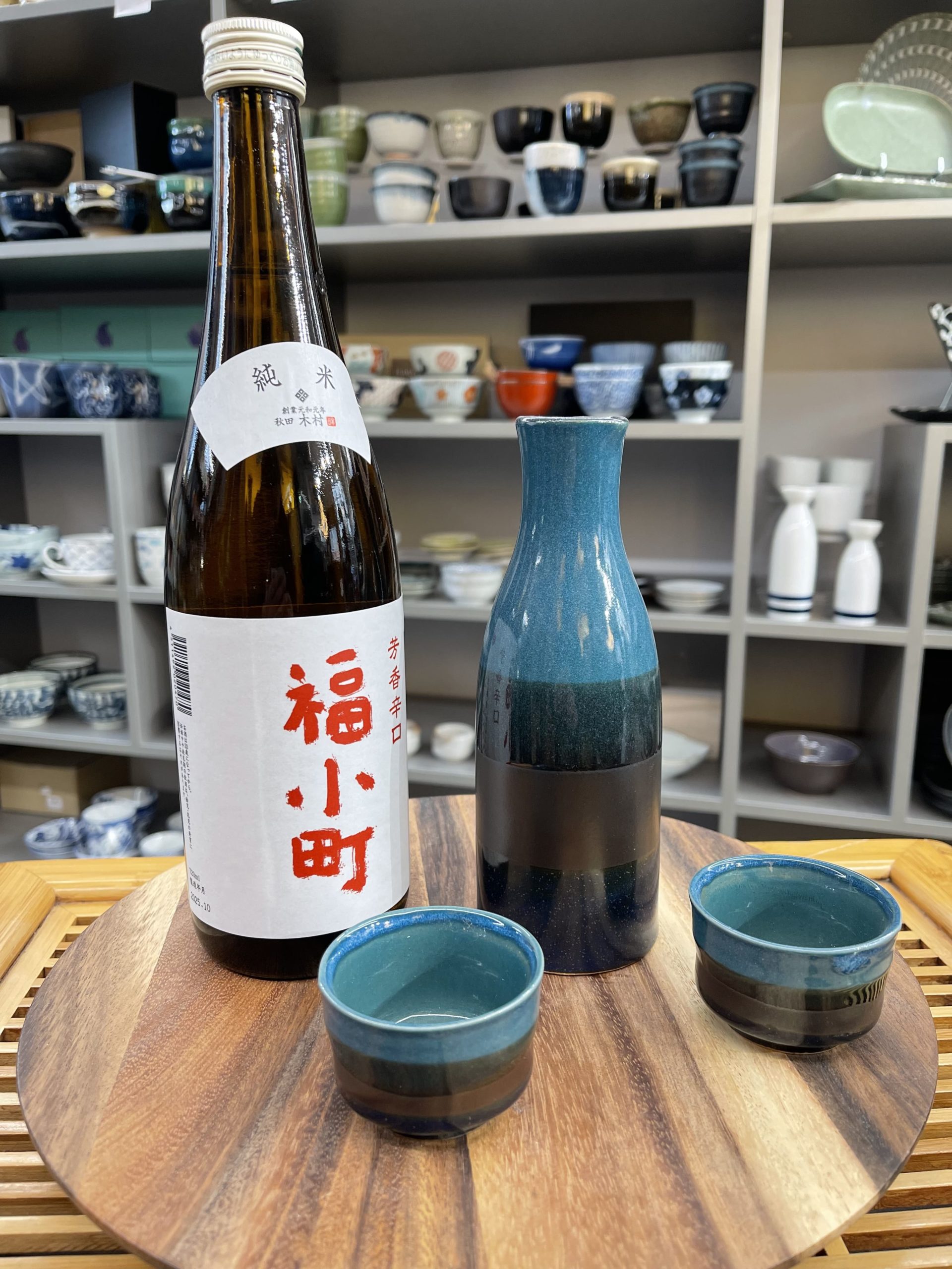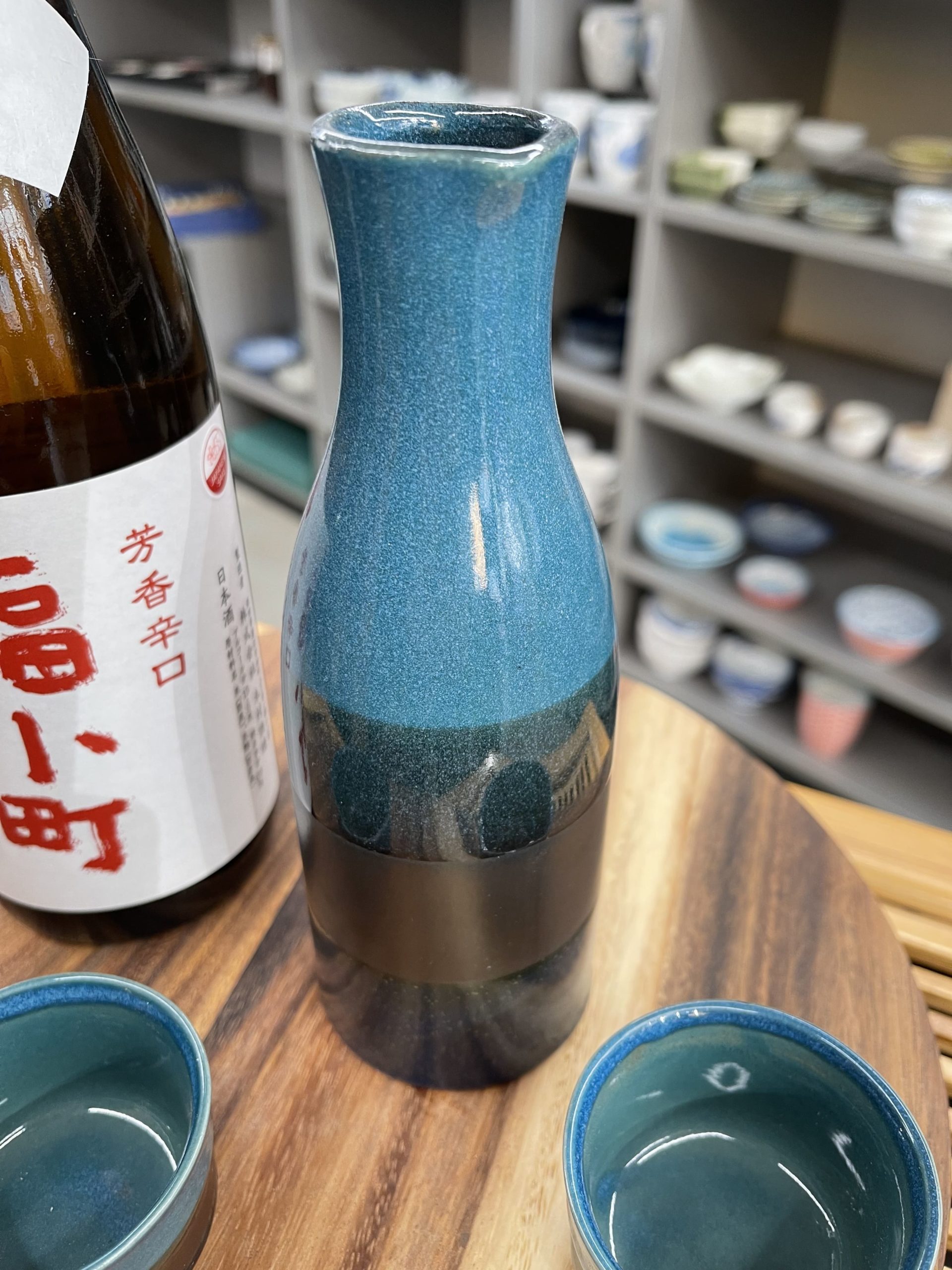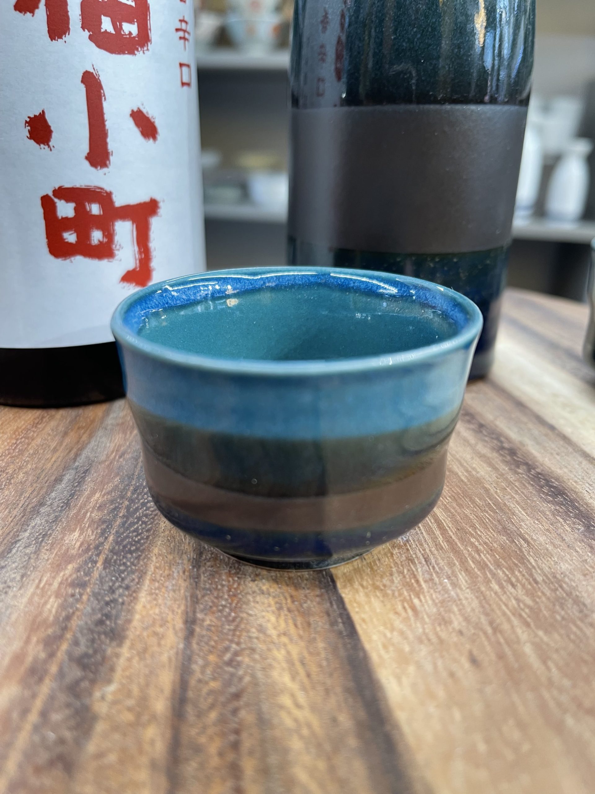 Très beau service à saké traditionnel du Japon avec une bouteille et deux tasses assorties aux motifs lignes dégradé de bleu et noir. Une très belle proposition cadeau de fabrication artisanale du Japon.